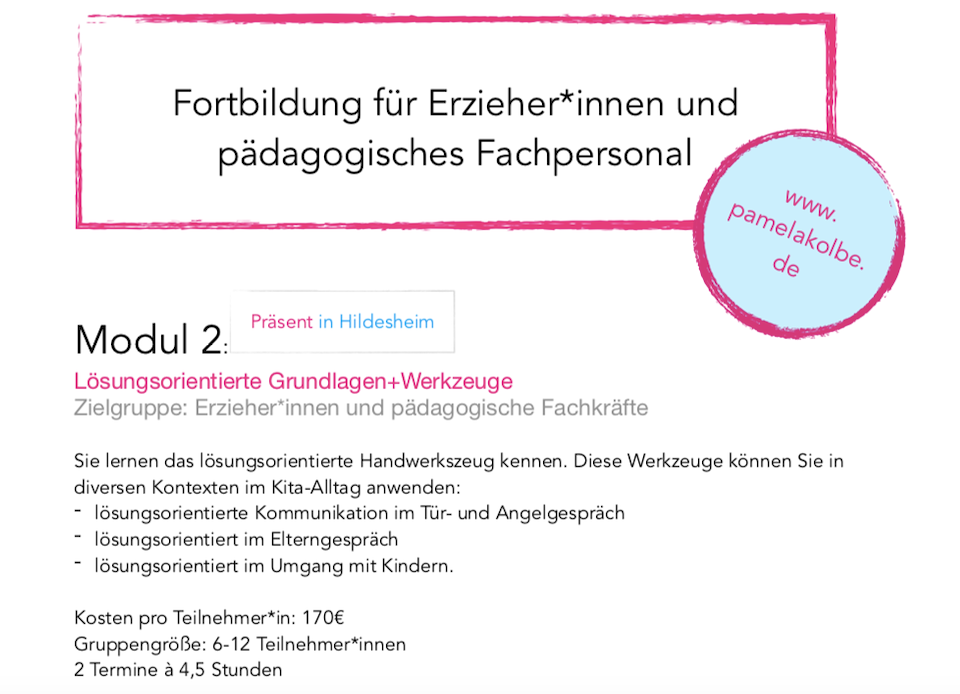 Die Fortbildungen sind geeignet für alle Schulformen und pädagogische Einrichtungen. Sie finden optimal in zwei Modulen statt. In zehn Stunden lernen Sie den lösungsorientierten Ansatz kennen und erproben erste Schritte in Ihrem Arbeitsfeld.